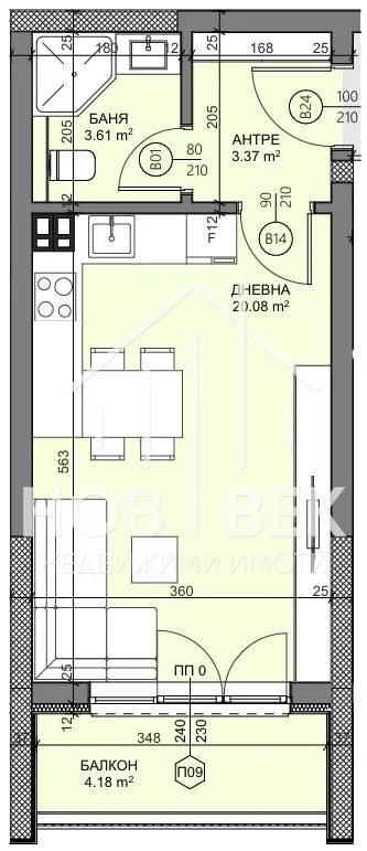 Имотът е с чиста жилищна площ от 37.71 кв.м. и се състои от: коридор, дневна с кухня и трапезария, балкон, баня с тоалетна. Към всеки имот ще бъдат включени съответните идеални части от общите части на сградата, както и от земята върху която ще бъде изграден обекта.
