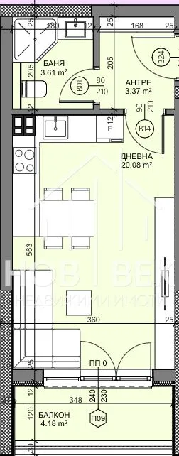 Имотът е с обща жилищна площ от 37.71 кв.м, изцяло южно изложение, разположен на четвърти етаж и се състои от: коридор, дневна зона с кухня и спална зона, балкон, баня с тоалетна. Към всеки имот ще бъдат включени съответните идеални части от общите части на сградата, както и от земята върху която ще бъде изграден обекта.