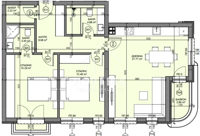 Имотът е с чиста жилищна площ от 94.05 кв.м. и се състои от: коридор, дневна с кухня и трапезария, две спални, един балкон, баня с тоалетна, килер/перално, втора тоалетна . Към всеки имот ще бъдат включени съответните идеални части от общите части на сградата, както и от земята върху която ще бъде изграден обекта.