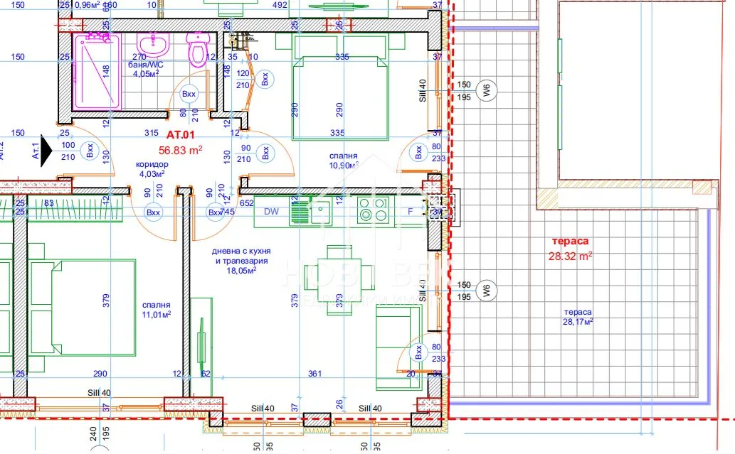 - дневна с кухня и трапезария – 18,05 кв.м.;